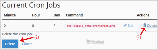 1. Under "Current Cron Jobs", locate your cronjob and then click on "Delete" button