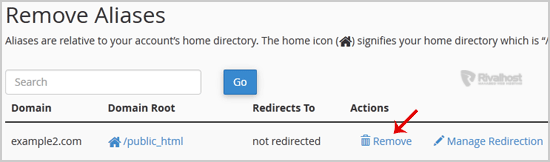 Under "Remove Aliases", locate the parked domain name and click on the "Remove" link.