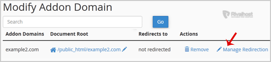 3. Under "Modify Addon Domain", locate the addon domain and click on "Manage Redirection".