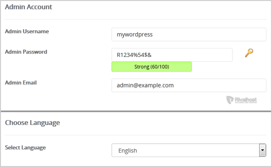 - Admin Username: Your new WordPress username (for security reason do not use the "Administrator" or the "Admin" username.