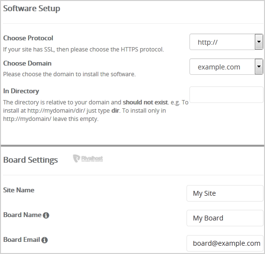• In Directory: If you want to install this in a directory, for example example.com/forums, enter the directory name. Otherwise, leave this blank to install in your main domain example.com