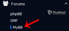 5. On the left side of your screen you should locate the "Forums" category. Click on it and then click on the "MyBB" link that will appear.