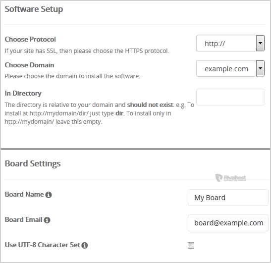 • In Directory: If you want to install this in a directory, for example example.com/forum, enter the directory name. Otherwise, leave this blank to install in your main domain example.com