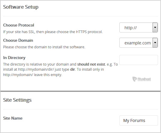 - In Directory: If you want to install this in a directory, for example example.com/forum, enter the directory name. Otherwise, leave this blank to install in your main domain example.com