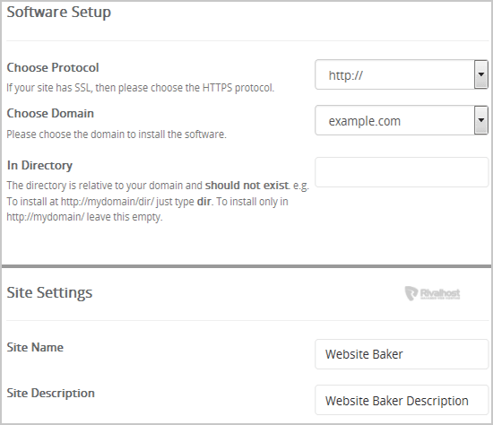 • In Directory: If you want to install this in a directory, for example example.com/directory, enter the directory name. Otherwise, leave this blank to install in your main domain example.com
