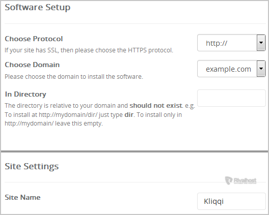 • In Directory: If you want to install this in a directory, for example example.com/directory, enter the directory name. Otherwise, leave this blank to install in your main domain example.com