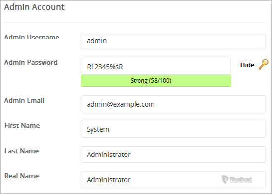 Admin Email: Your e-mail address. - First Name: Enter your first name