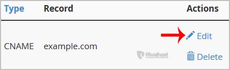 4. Locate CNAME Record you wish to edit or remove. Should you wish to edit a CNAME record, click the "Edit" option, modify the details and then click on "Save Record". Removing a record can be done with the "Delete" option.