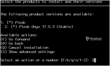 Step 2: Now you can select a version. For Plesk, type 1 and for Plesk Onyx, type 2. Then press enter. Type "F" and press enter again to go to the next option.
