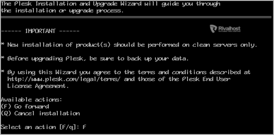 Step 4: Press "F" again. The installation will begin, which can take as long as 20 to 30 minutes. If it shows a hostname-related error, do not quit the installation. Sometimes Plesk only shows warnings and provides you with an instruction of how to fix your problem.
