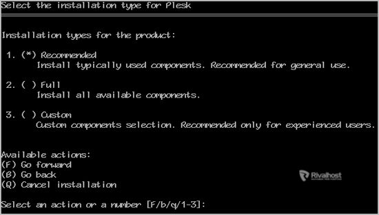 Step 3: In "Select the Installation type for Plesk" enter "F" or, in case you are familiar with what you are doing, chose the other option - installing all components by entering "2" (without the quotes) and press "F'.