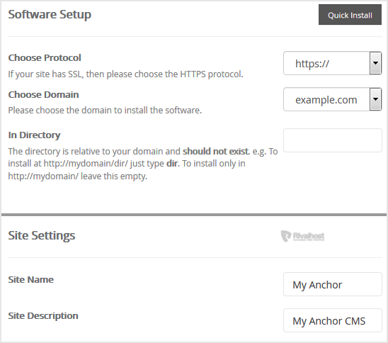 • In Directory: If you want to install this in a directory, for example example.com/directory, enter the directory name. Otherwise, leave this blank to install in your main domain example.com