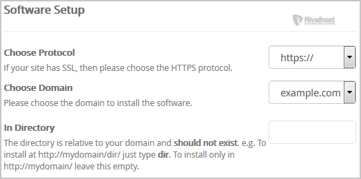 • In Directory: If you want to install this in a directory, for example example.com/directory, enter the directory name. Otherwise, leave this blank to install in your main domain example.com